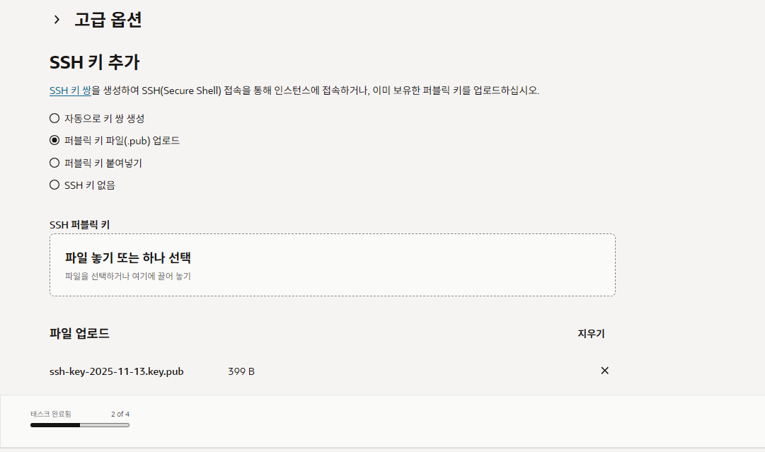 그러니 자동으로 키 쌍 생성이 아닌 , 퍼블릭 키 파일(.pub)를 인스턴스에 등록하는것으로 하도록한다