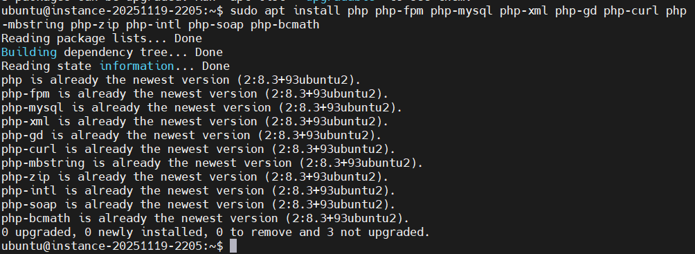 sudo apt install php php-fpm php-mysql php-xml php-gd php-curl php-mbstring php-zip php-intl php-soap php-bcmath