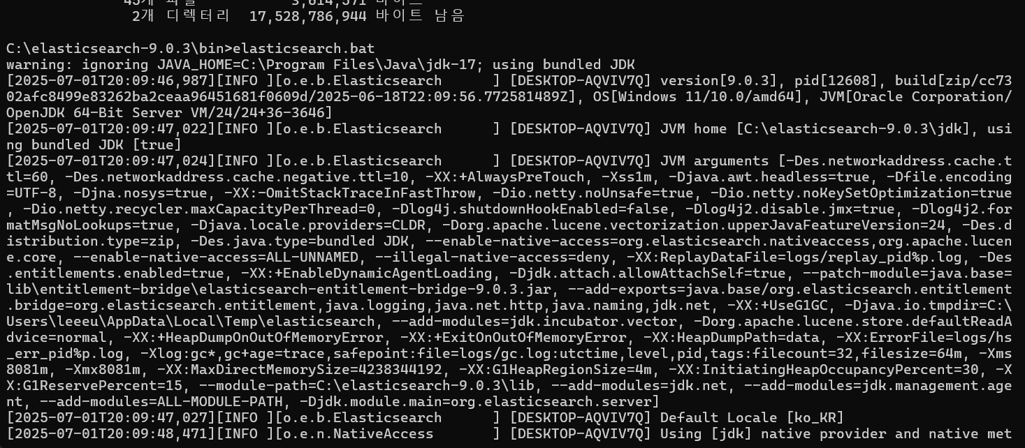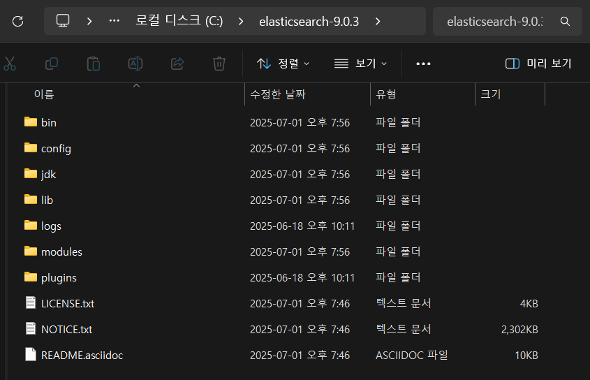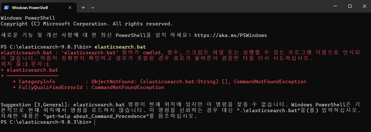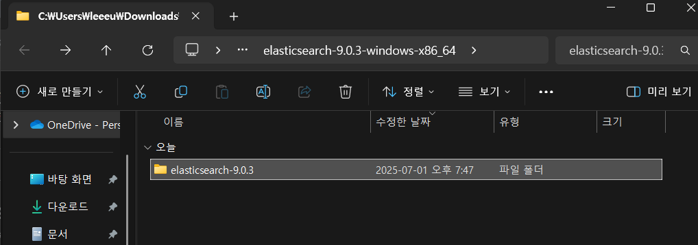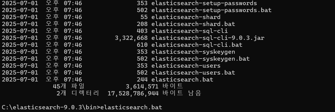 - C:\elasticsearch-9.0.3\bin\ 폴더로 이동합니다.