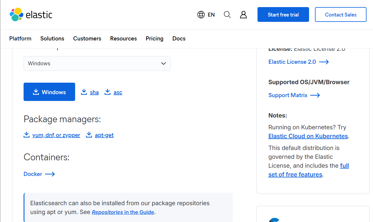 https://www.elastic.co/downloads/elasticsearch - "Windows" 버전의 ZIP 파일을 선택해서 다운로드