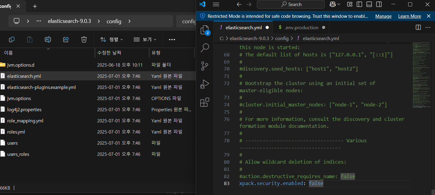 아래 내용을 C:\elasticsearch-9.0.3\config\elasticsearch.yml 파일을 메모장이나 VSCode로 엽니다