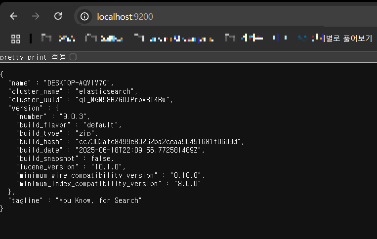 짠 이제 localhost:9200하면 이제 정상적으로 된다