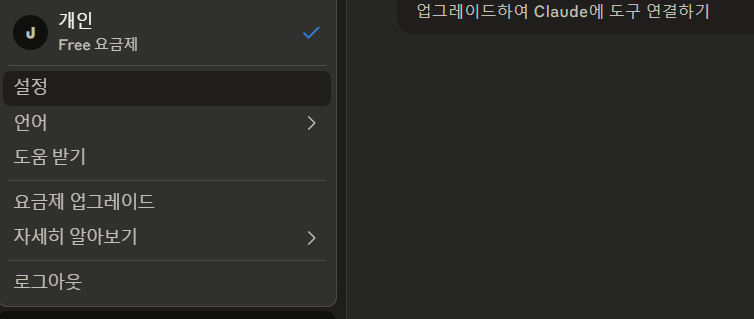 Claude desktop에서 왼쪽 하단에 이름을 클릭하여 > 설정으로 갑니다.
