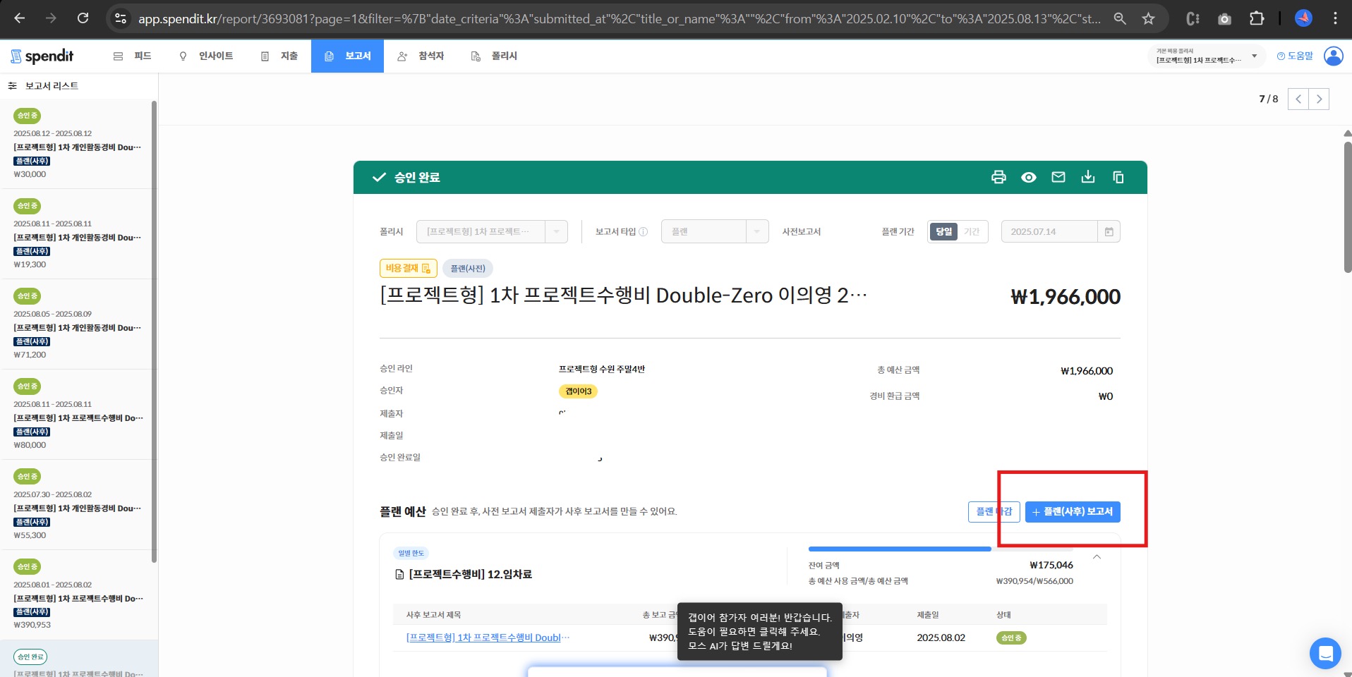 아래 승인 받은 두개의 보고서중에 프로젝트수행비를 작성합니다