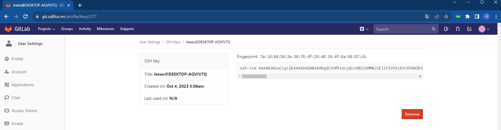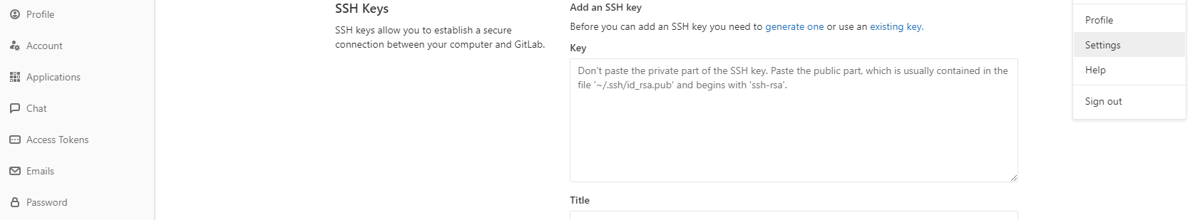 gitlab 접속 후, 우측 내 profile를 클릭하면, profile과 settings , Help 가 나오는데 > Setttings 클릭 후 왼쪽에 있는 SSH keys를 클릭 한 후, key에 복사한 키를 저장한다.