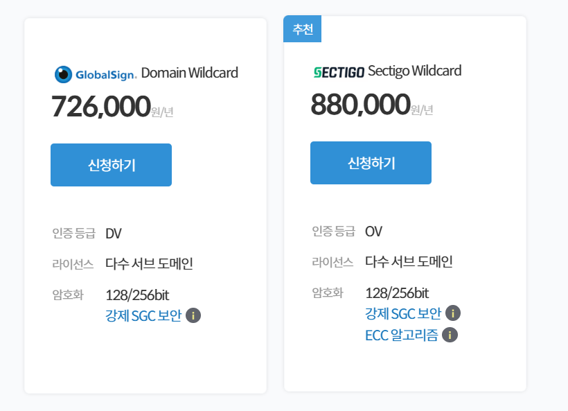 저번에 와일드카드로 구매해야한다고 했는데 (ssl인증서 종류) 가비아에서 제공하는것은 두개.