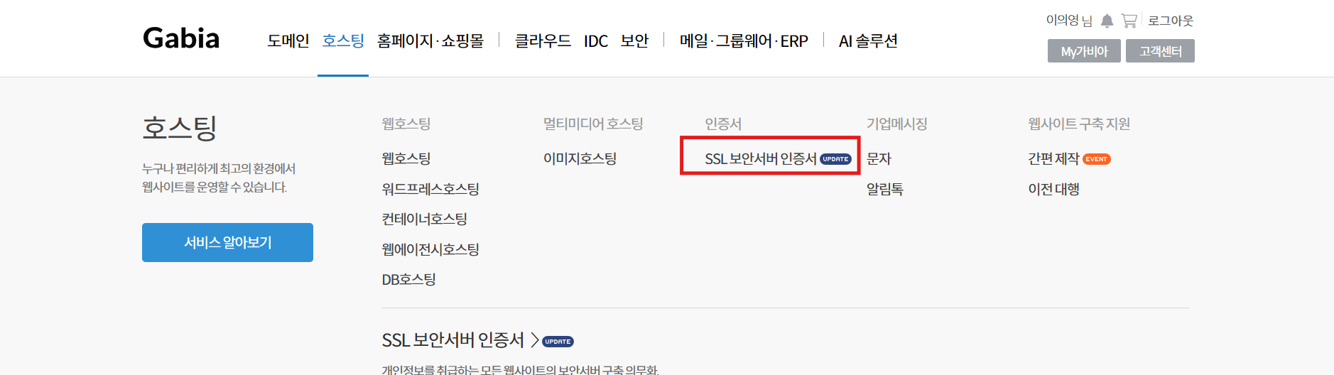 [메뉴 > 호스팅 > SSL 보안서버 인증서 클릭]