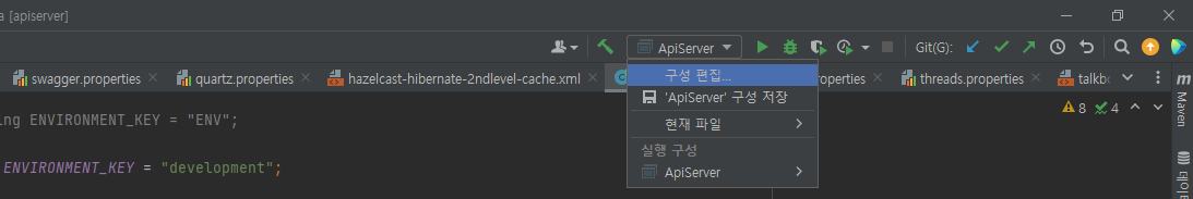 실행 디버그 구성을 우측 상단에서 들어가는 방법과 Run/debug Configurations 선택